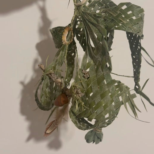 Custom made hangable sculptures. One of a kind woven baby palm leaf, embedded with symbolic blessings to your request. A perfect gift for a newborn, a birthday or a new home. Inspired by the indigenous Natives of America’s custom to give a medicine bundle for every new soul that joins the world, I opened up the bundle and hung it out to be seen and admired.